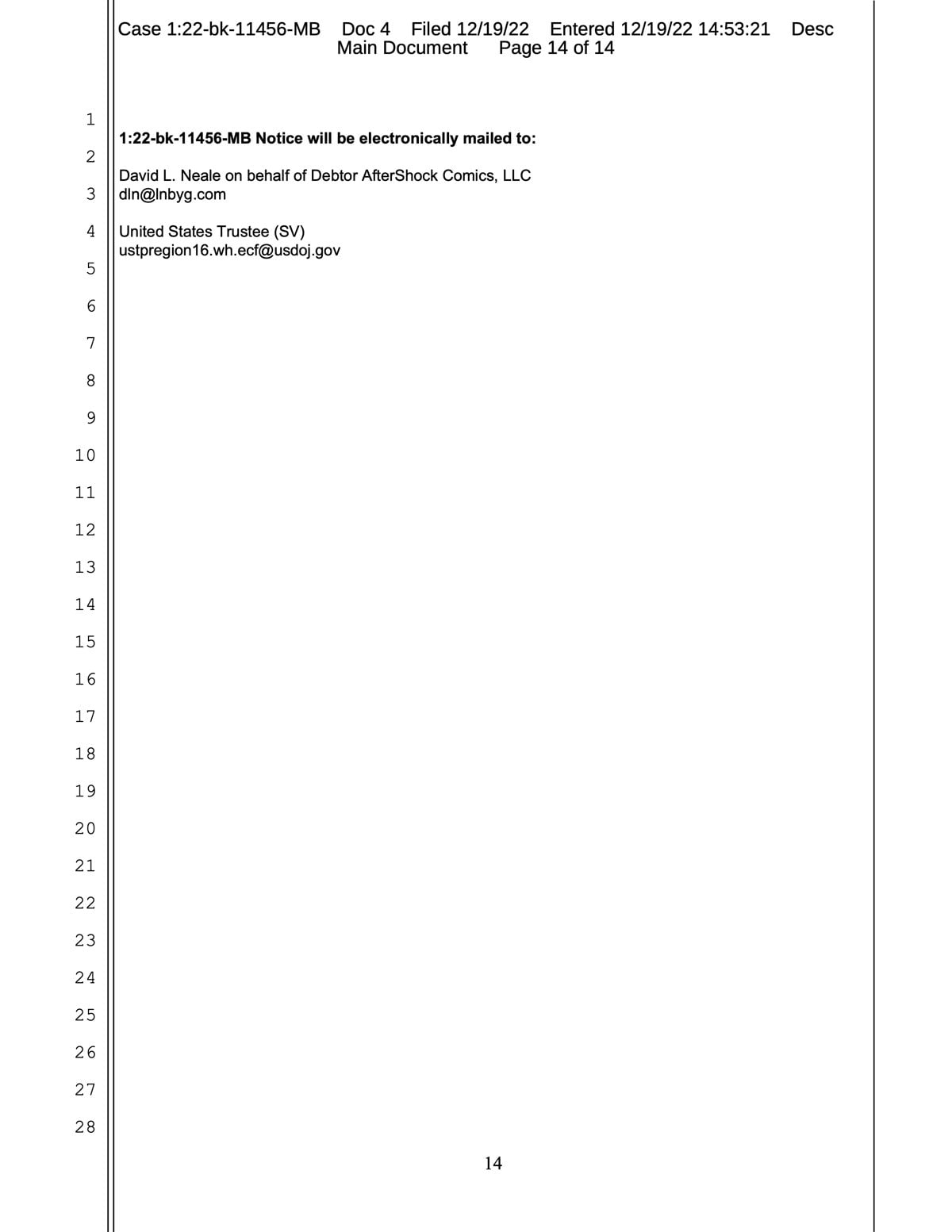 AfterShock’s new filing notes that, “Although the Debtors attempted pre-petition to negotiate in good faith to reach an agreement with the Lender, those negotiations reached an impasse.” That part might be important when constructing a timeline of what happened and when; the mention of pre-petition means that AfterShock and Rive Gauche were clearly aware of Access Road’s position, making the September 12 authorization of Lee Kramer to initiate bankruptcy proceedings for both AfterShock Comics and Rive Gauche all the more notable.
