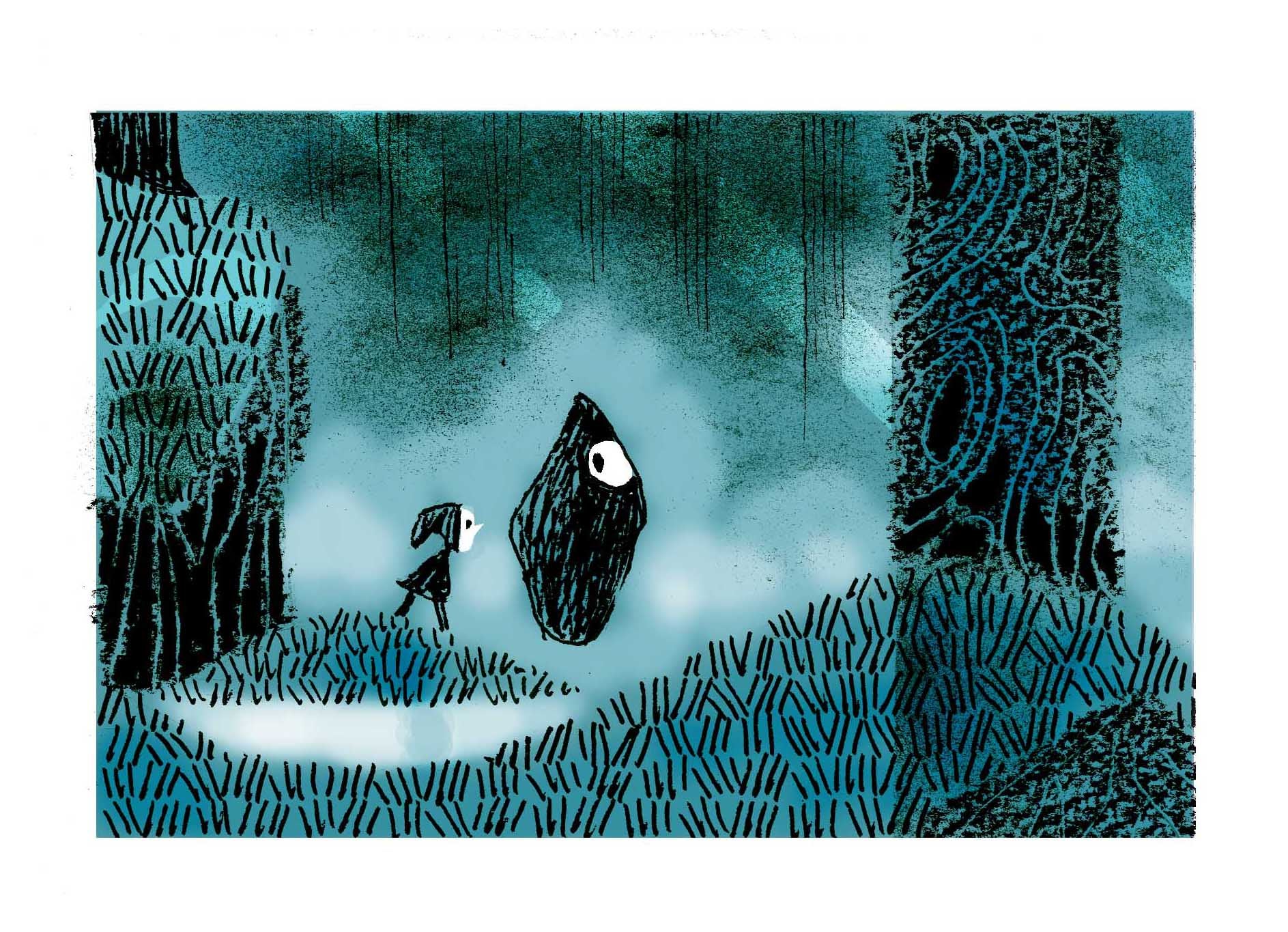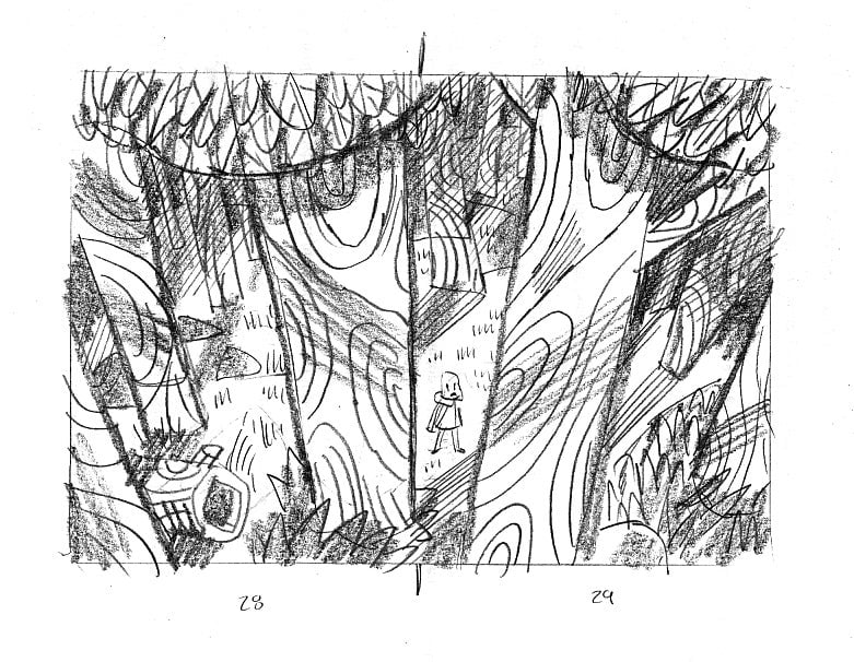 The design was kind of the starting point really, because it was inspired by a short animation called the Hedgehog in the Fog [dir. Yuri Norstein, written Sergei Grigoryevich Kozlov]. It's a classic piece of animation. It's very poetic and very kind of Russian as well. It's very textured and atmospheric, and it's set in a forest, and that was my starting point. I started from the idea of a dark forest— traditional fairy tale stuff, which I'm really into. I used Chinagraph pencils on watercolor paper to get textures and shapes and get the feel of an oppressive forest environment.
