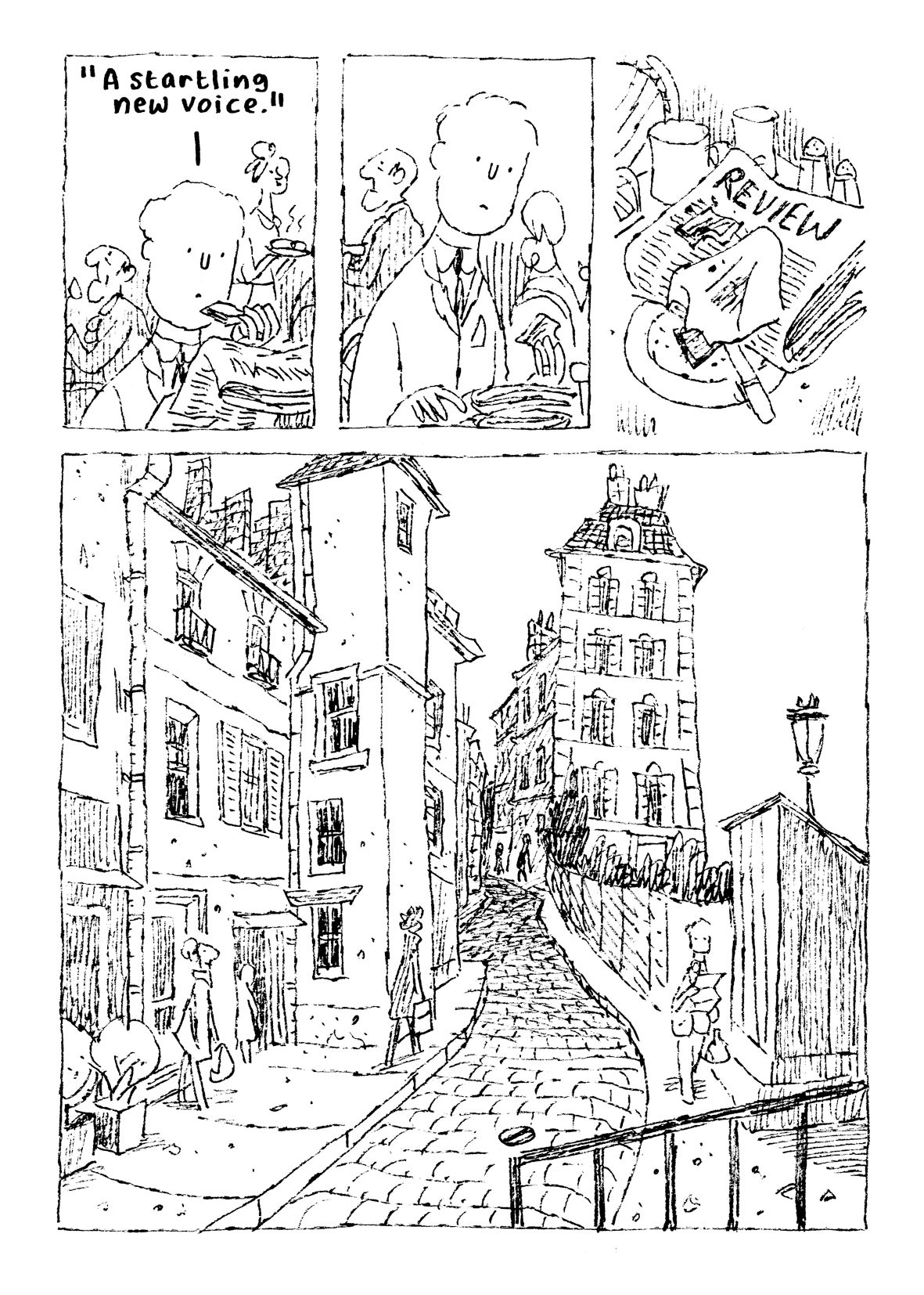 However, when The Book Tour began to gestate a bit more, I had this idea of an author who goes on tour. Initially, it was the story of the author who never meets any readers, he only meets writers. So that's my first draft approach, and then I add this book of Paris photographs as reference, which this would be the place where this story was set, and I had my own experiences, and then the story changed. There was an idea of a murder mystery element as well. So again, there's something new to explore, as I develop, as I do another draft. Things get together like a snowball, like the story and art are a snowball at the top of the hill and you push it down and gradually it grows in size and more interesting ideas get involved and folded in.