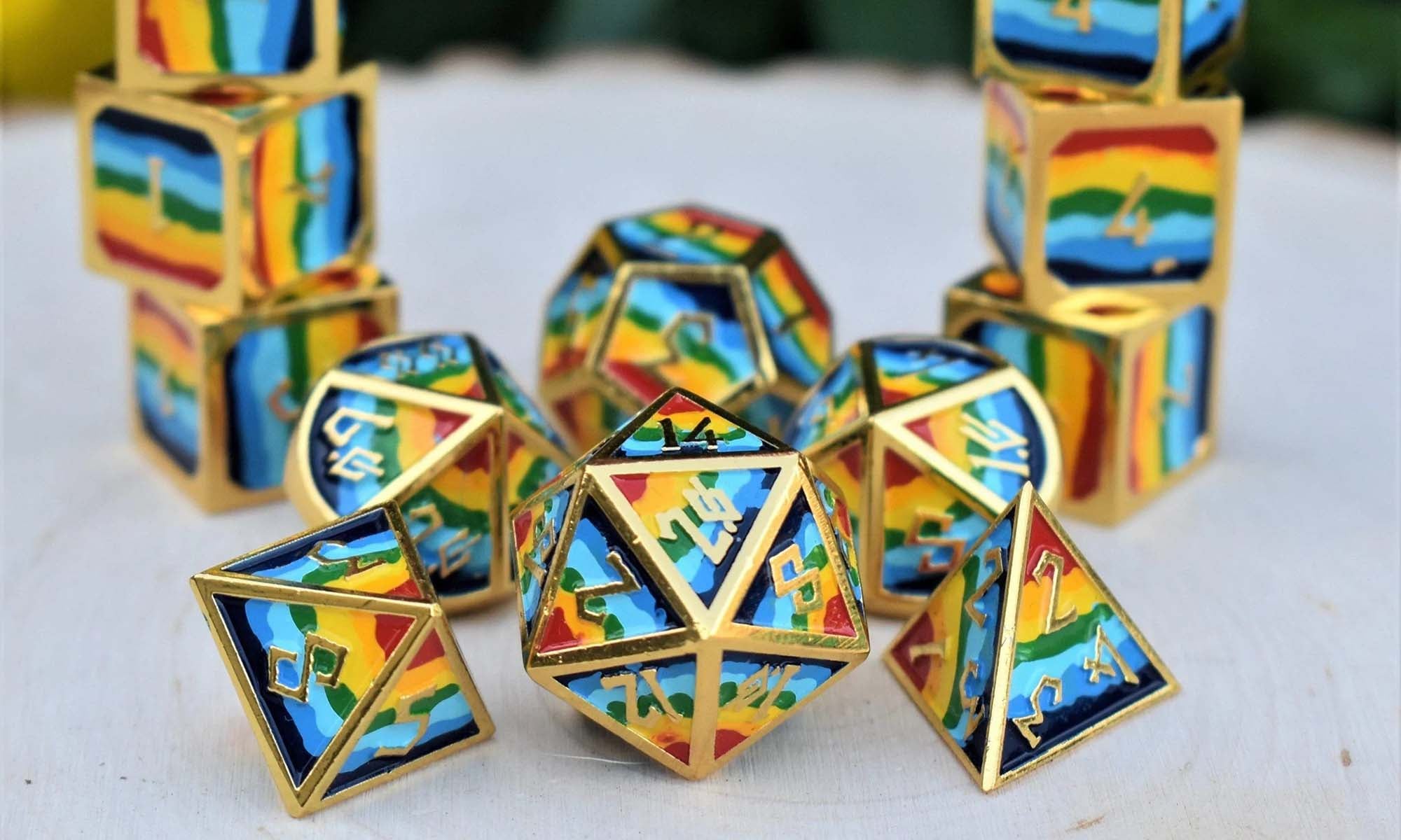 - Elder Runes Pride And Gold 7pc Polyhedral DND RPG Metal Dice Set - $43.99: Clinky-clanky is the new clicky-clacky with these charity metal dice.