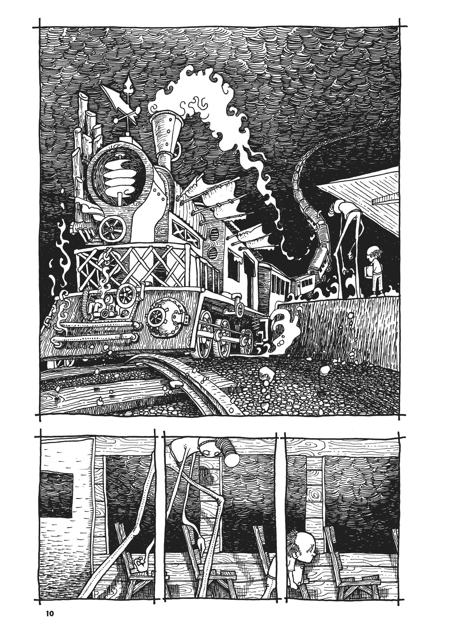 There are many artists that influenced me, and I think the art style is a mixture of all of them. Franklin Booth, W.H. Robinson, N.C. Wyeth, Edward Gorey, Kay Nielson, to name a few. I am greatly influenced by the visuals of cinema as well, especially the storytelling and visual narrative of German expressionism and the frighteningly humorous Looney Tunes' background designs of Maurice Noble and Paul Julian.