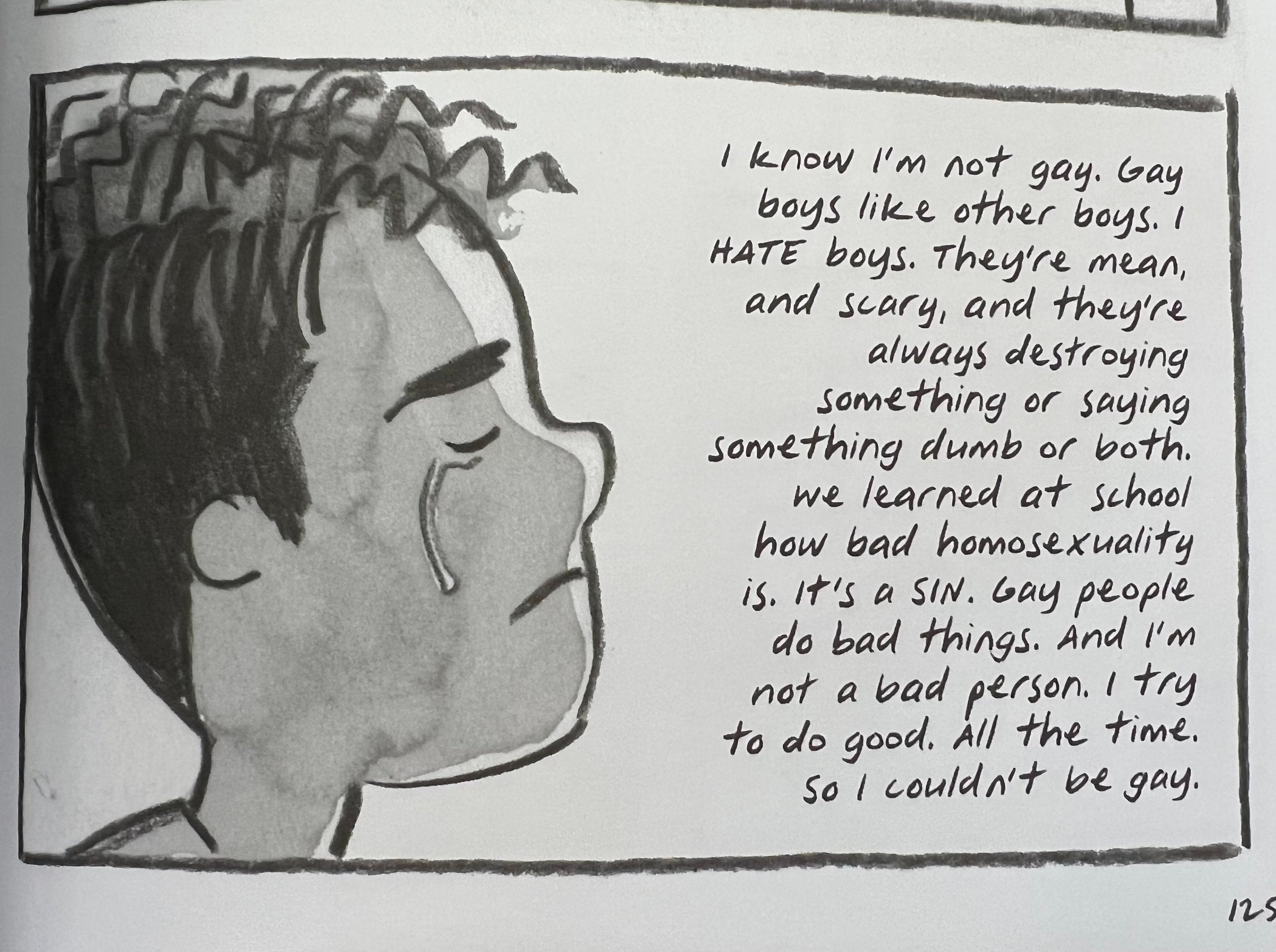 Like Kobabe, Curato was dumbstruck that his childhood memoir Flamer was condemned for inappropriate sexual content. “The amount of sexual situations in the book amounts to 4 pages [the book is 368 pages long]. And there is no real interaction.” In fact, much as in Kobabe’s Gender Queer, the main sexual situation shows Curato’s character uncomfortable with what other boys are doing off-panel and realizing he has to get out of there.