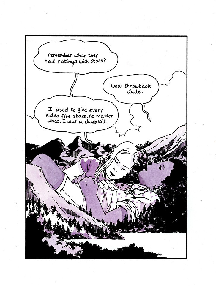 Each page of I Love This Part offers one moment in the love story between two teenage girls who are each just beginning to explore their own identities. In Walden's hands, their relationship has a quietly fantastic quality; they stride across a watercolor universe as giants, oblivious to the mountains or buildings around them as they kiss, watch movies, and talk. At other moments they disappear entirely, just their voices or notes of music left as traces of what they had. I Love This Part captures what your first love feels like, and how it lives on in the world even when it's gone.
