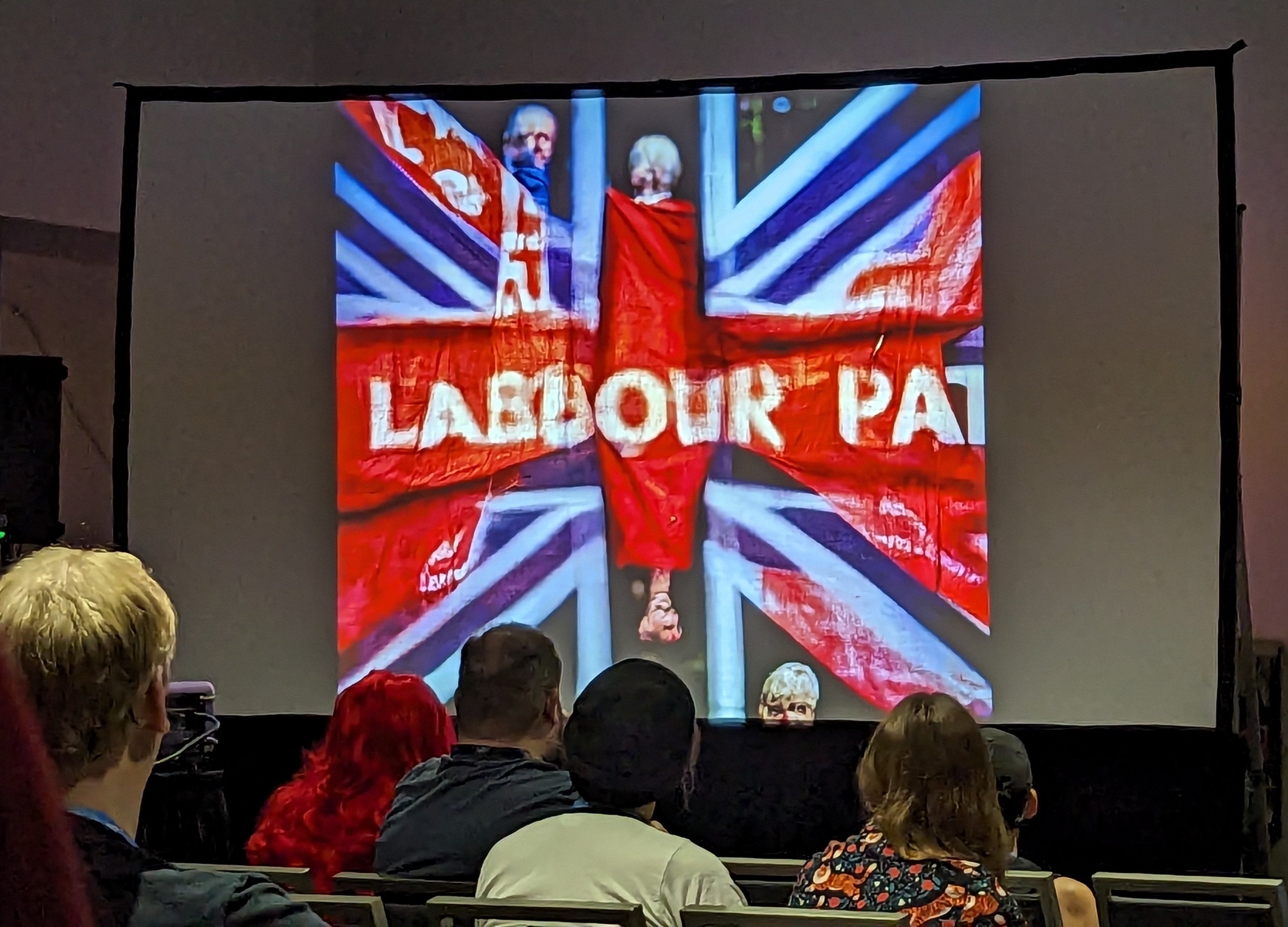 “The second chapter is one of my favorites because I fed the bots from my local newspaper headlines. I wanted to see how AI sees us — almost a Black Mirror replication of how it sees our world,” McKean said, displaying an image seemingly of a Union Jack and several warped faces of politicians. “The words I entered here were something about the Labour Party being the Party of British Values. And as you can see it’s combined the red of the Labour Party flag with the red of the Union Jack, and has wrapped these people – these politicians — in that flag; which is its own saying when someone is supremely patriotic: being wrapped in the flag. I really enjoyed this because it’s almost like the AI came up with its own joke.”