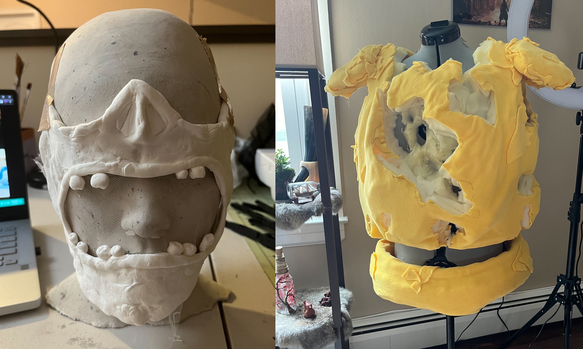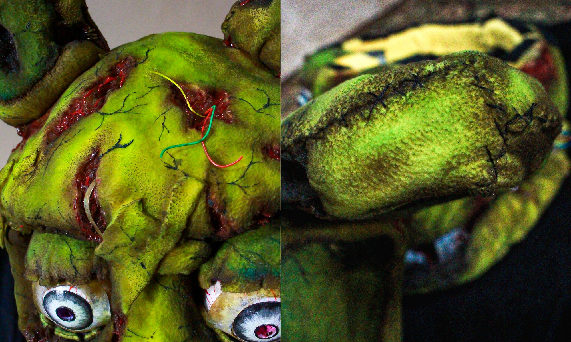 I’ve never made a full suit like this before, so I had to research what materials to use. I spent numerous hours shaping and carving ProjectFoam, gluing yellow fleece to everything, hand sewing details and the lining, countless hours airbrushing the whole thing, then going back in with detail painting by hand. Not to mention the other detailed work such as adding yarn to areas for “organs”, and gluing wires and aluminum metal for the endoskeleton parts. Over 7 months and 200 hours of work!