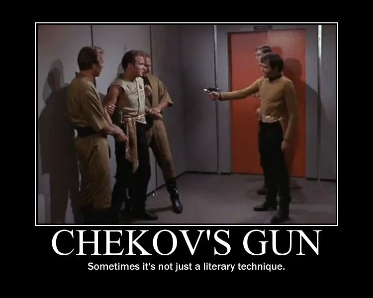 (Props, by the way, to the writing team for the use of the gun. It's a clear nod to playwright Anton Chekhov, who famously said if you introduce a gun in act one, you have to fire it at some point, and also a Star Trek pun.)