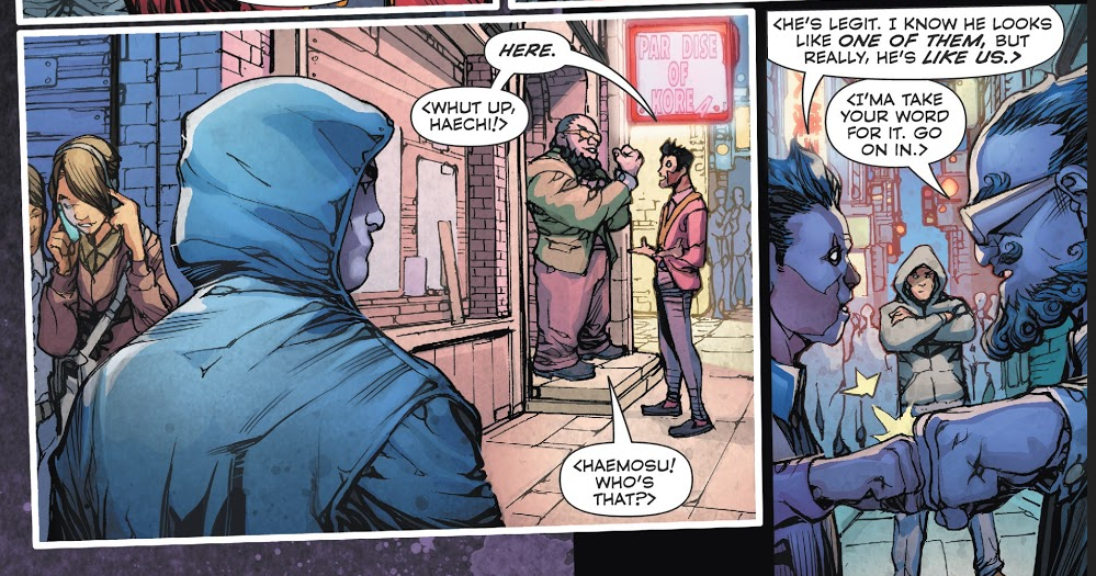 Yang surrounds Superman with a cavalcade of Asian characters and settings featuring him eating Asian food and having Asian drinks. And in telling panels like above, Yang has Asian characters tell security at Asian establishments “He’s legit. I know he looks like one of them, but really, he’s like us.”