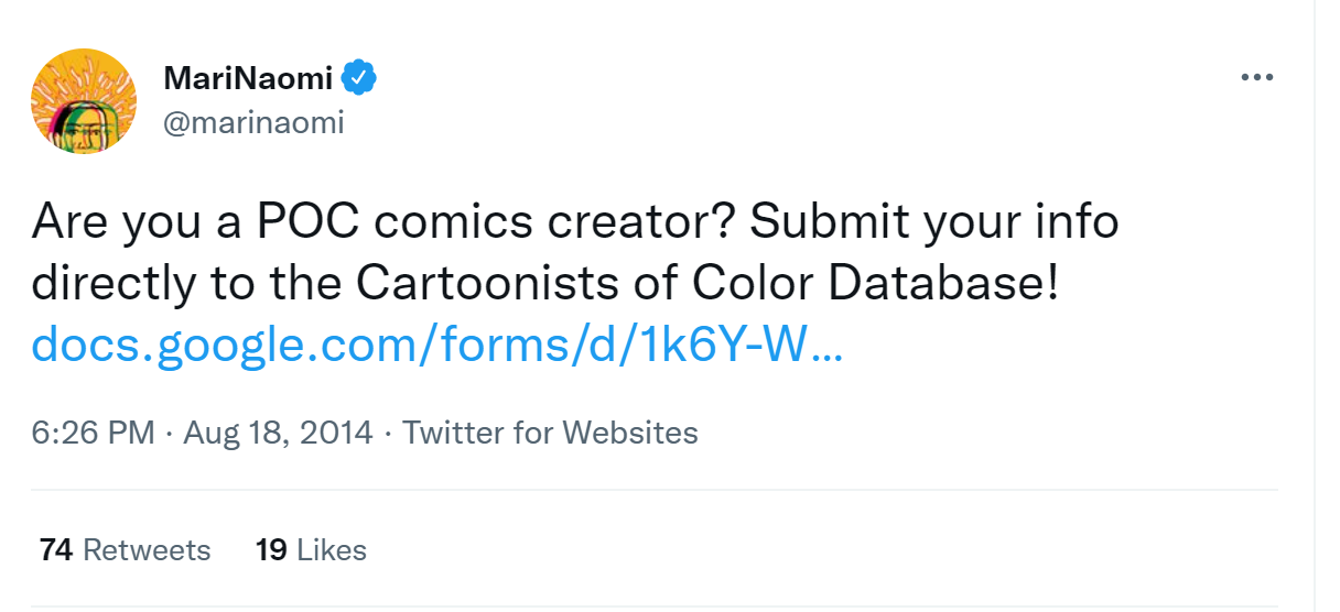 So they set up a Google form and shared the link on their MariNaomi Twitter feed in August 2014. Hundreds of submissions poured in. At the time, people in publishing told her that stories about her experience as a person of color weren't universal enough. The flood of responses to her call for the Cartoonists of Color Database proved that those publishing contacts were ignorant.