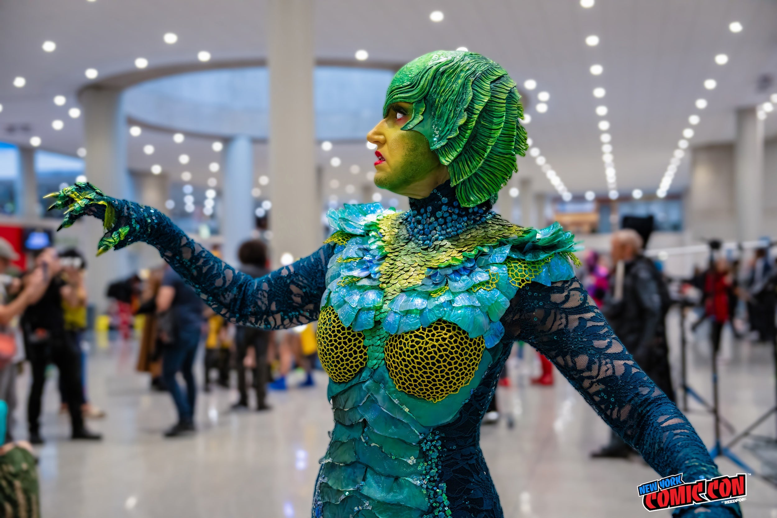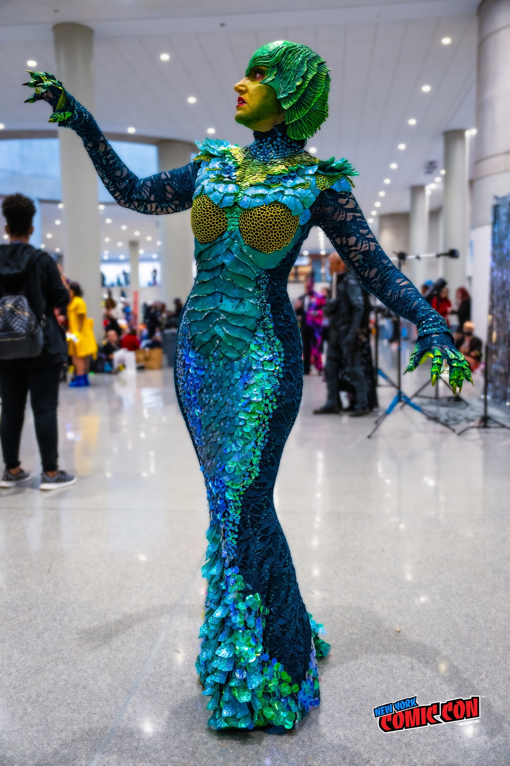 The helmet is self-patterned with an EVA foam base and fins. I used a thin layer of worbla around my face so it would fit tightly. The EVA fins were scored and overheated so they would split and curl up on themselves. The sculpted details are EVA foam clay. It’s sealed with flexbond and painted with acrylics. The gloves are self-patterned, and hand sewn, with EVA foam clay details and press-on nails for talons. The feet are boot covers with EVA foam and foam clay on a felt base. I spent over 350 hours on this, the majority spent attaching the sequins.