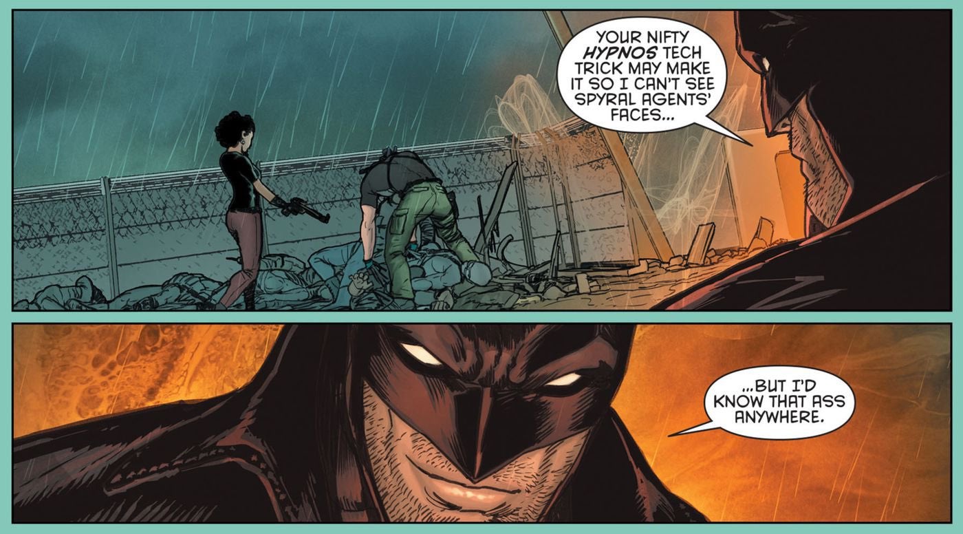 By the time Tim Seeley, Tom King, and Mikel Janin launched the ongoing series Grayson, with Dick temporarily ditching his Nightwing persona to become a globe-trotting secret agent, the character had grown into a widely recognized in-universe sex symbol for the DCU. Throughout the series, women openly ogled Dick’s fine form while the WildStorm superhero Midnighter was able to identify Dick primarily on the distinctive shape of his glutes even as Dick remained undercover, an exposure echoed by Batgirl in her own solo adventures at the time. Grayson’s tongue-in-cheek tone set the series apart from its darker Bat-Family contemporaries.