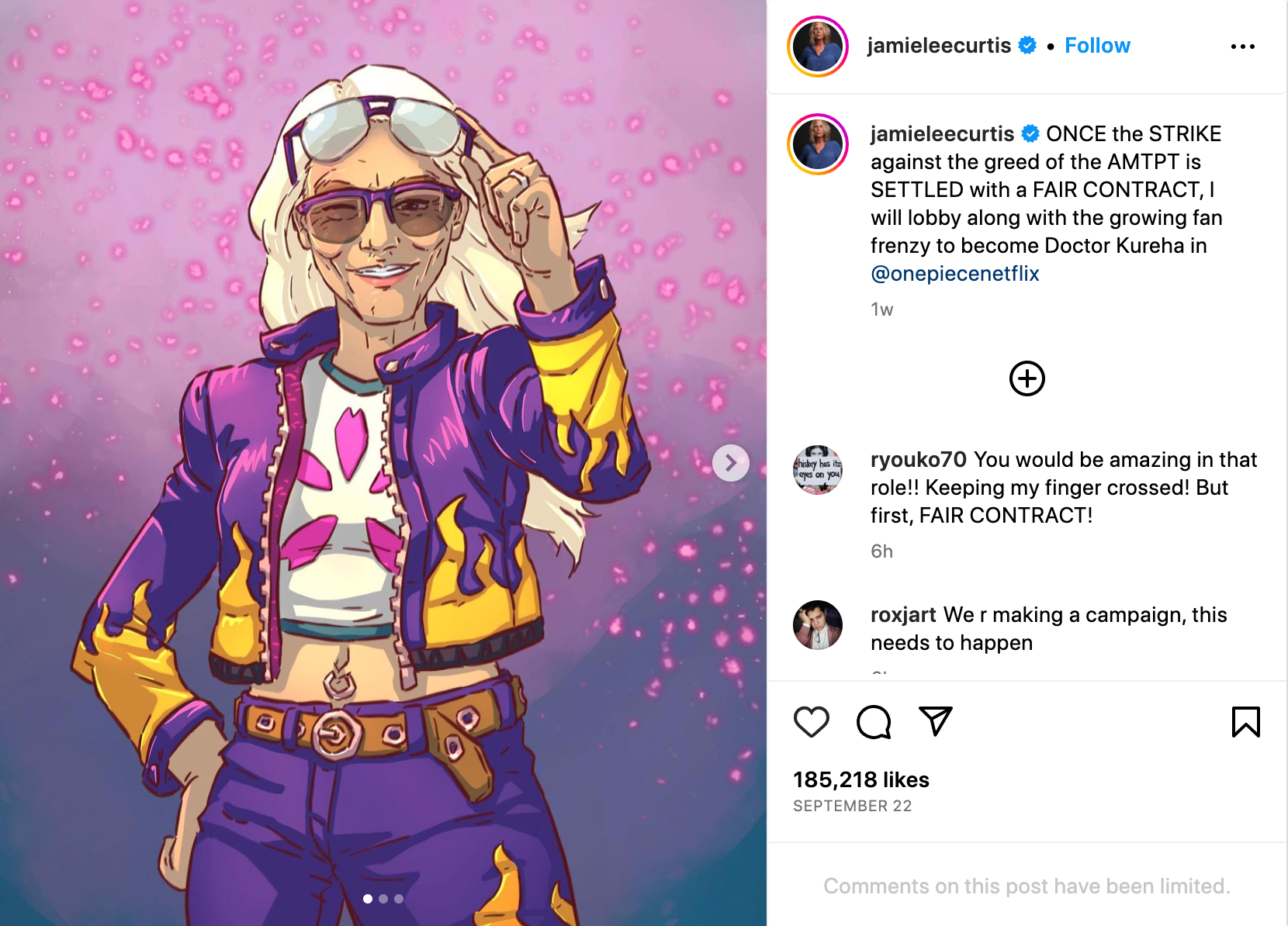 Let’s back up a bit. On September 22, Curtis made a post to her Instagram featuring a picture of the character Dr. Kureha, a badass doctor and ally to the ragtag Straw Hat Pirates. Check out the post below: