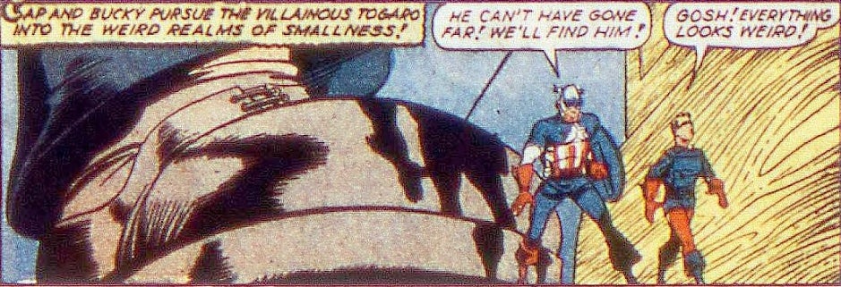 Captain America #25-26 is a crazy story, with Captain America and Bucky repeatedly shrinking down (and also embiggening up) to fight the trolls. It also features a version of Captain America who has the smarts to “whip up” his own shrinking pill within five minutes of getting a hold of the princess’ last dose, and the wonderfully brilliant idea of simply stealing the rock in which Mita’s universe exists in order to protect it.