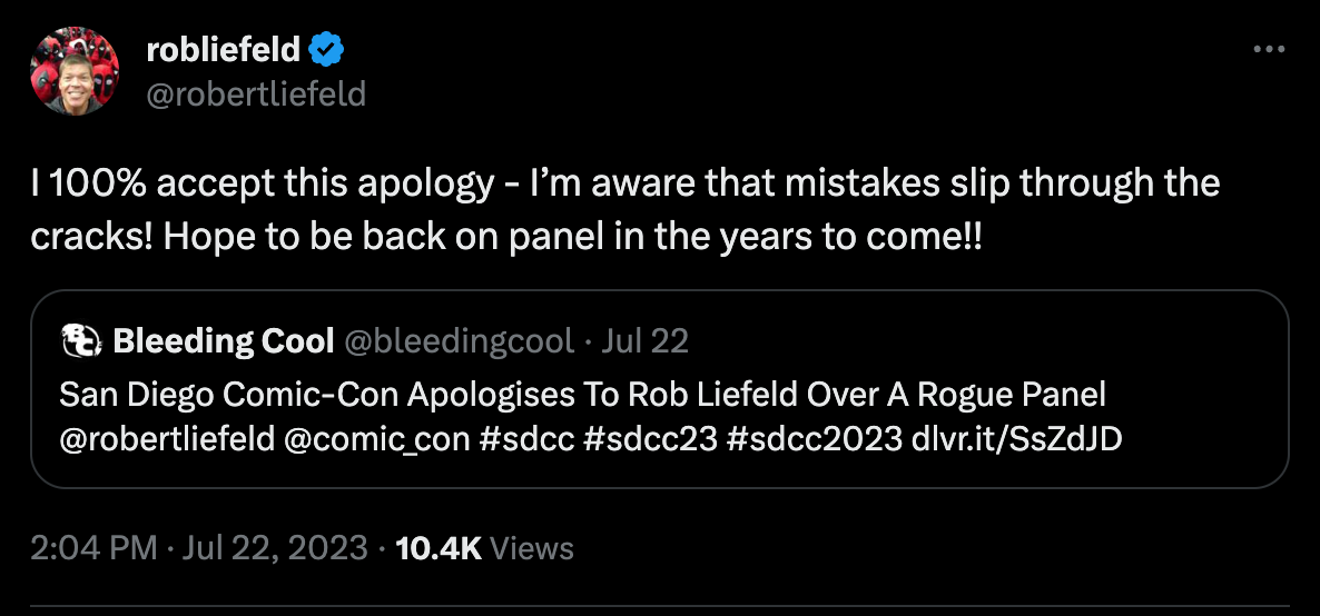 Friday evening at San Diego Comic-Con 2023, we were sitting in Room 5AB waiting for the start of the Rob Liefeld: Badder Blood panel, which the program described as “Deadpool creator Rob Liefeld discusses his return to Marvel Comics with the new five-issue series Deadpool: Badder Blood and its successful sold-out launch in June 2023.” The problem is, we waited for close to 45 minutes and Rob never showed up. Even the most devoted of fans started to get restless around half an hour in.