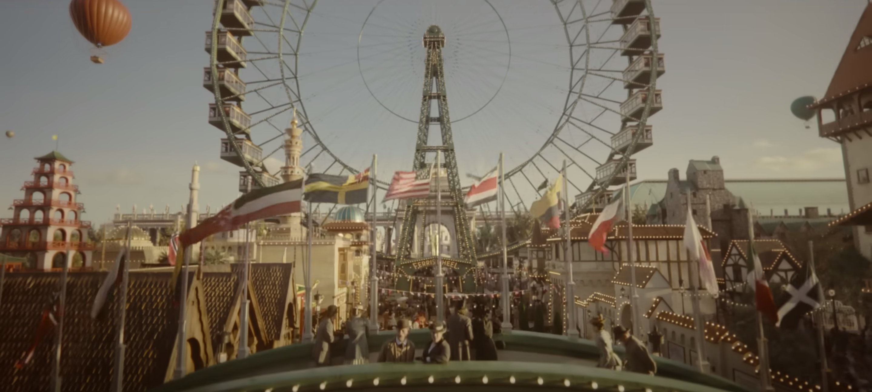 At about the minute mark of the Loki S2 trailer, we see Tom Hiddleston's titular God of Mischief and Owen Wilson's Mobius M. Mobius appear in late 19th century garb. In the very next shot, we see they are standing under a large Ferris Wheel, seemingly the centerpiece of some urban celebration, like a holiday or perhaps...a fair?